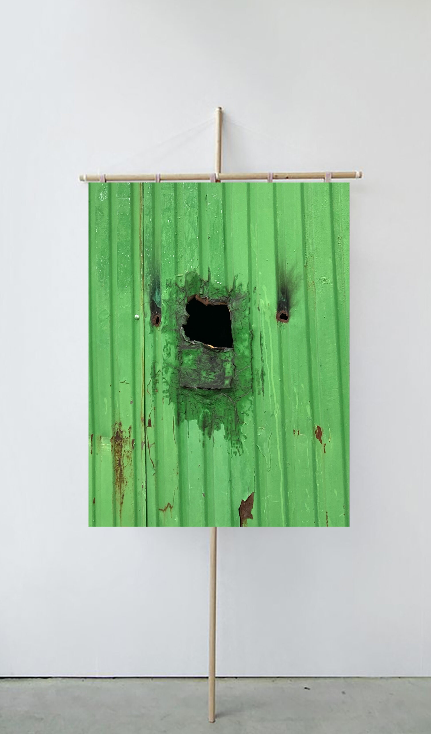 Фотография, печать на атласе, деревянные рейки, нити.