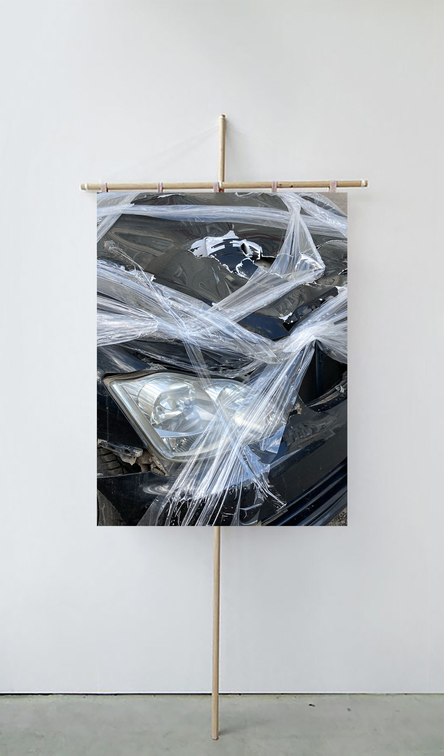 Фотография, печать на атласе, деревянные рейки, нити.